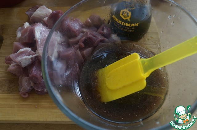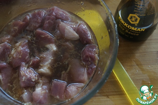 Мясо нарезаем не большими кубиками. Готовим маринад, для этого смешиваем соевый соус, уксус, сахар, тертый имбирь и растительное масло.