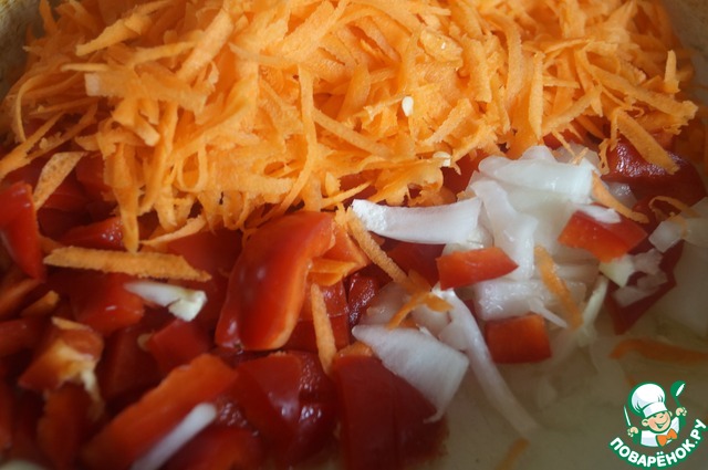 Лук мелко нарубить, перец нарезать кубиками, морковь натереть на терке.
