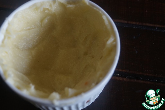 Формочки для запекания смазать сливочным маслом, выложить немного пюре и распределить по дну и стенкам формочек.