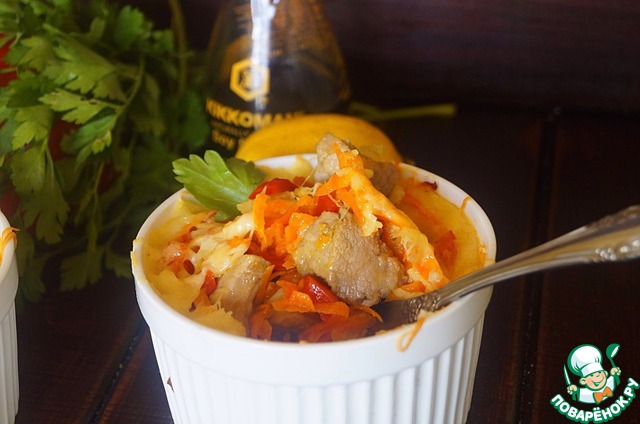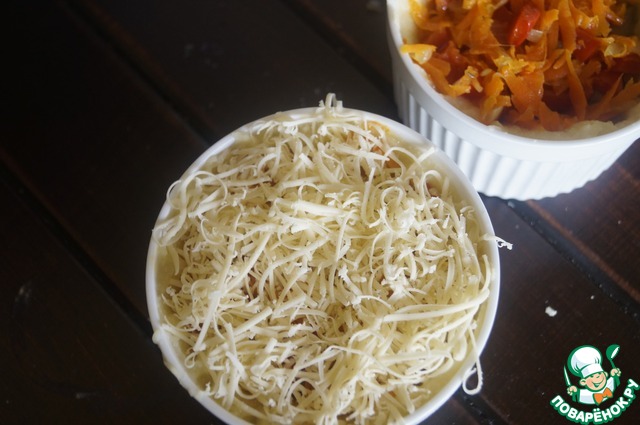 Выложить 1 ст. л. овощей, затем мясо и снова овощи, присыпать тертым сыром.