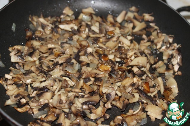 Шампиньоны моем, мелко режем. Очищаем лук и мелко нарезаем. Обжариваем на сковороде. Остужаем.