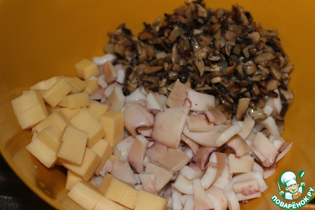 Остывшие кальмары нарезаем небольшими кусочками, добавляем грибы с луком. Сыр нарезаем также небольшими кусочками и добавляем к кальмарам. Все это превращаем в фарш, используя блендер, комбайн или мясорубку.