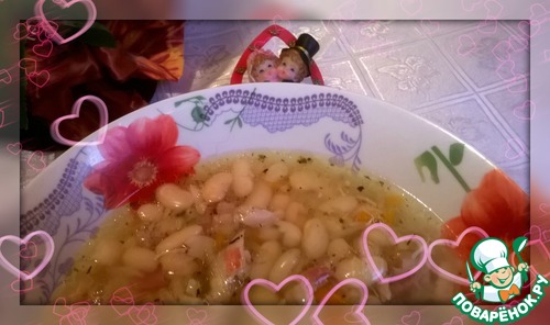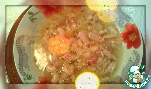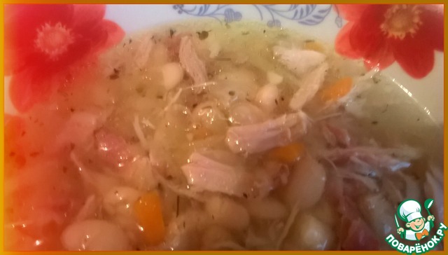 Фасоль замочить на ночь. Курицу вымыть, положить в кастрюлю, добавить фасоль, залить водой и поставить варить на1ч.20мин.