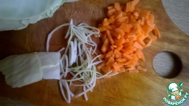 Морковь порезать тонкой соломкой. С капустой вышла незадача и я изменила Джейми... с капустой. В оригинальном рецепте была заявлена савойская капуста. Я честно обошла все супермаркеты и ничего не нашла. Джейми мне очень стыдно, но я выбрала самые нежные и тонкие листья капусты и вырезала все твёрдые части. Сворачиваем листья сигарой и тонко шинкуем. По прошествии нужного времени, убираем из бульона петрушку-лаврушку. Выкладываем капусту и морковь. Варить ещё 20мин.