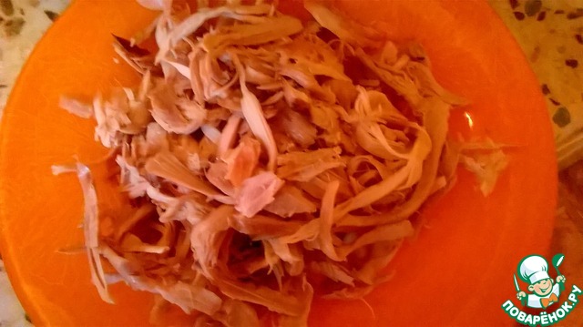 Вынуть курицу, мясо разобрать на волокна. Количество зависит от вашего желания, для нужной вам густоты супа. Мне хватило двух ног.