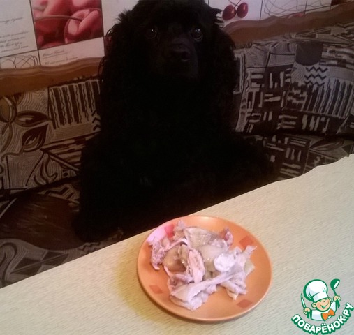 Шкурку, хрящики и т. д. отдала первому дегустатору. Вот он ждёт, когда остынет.