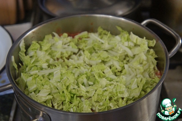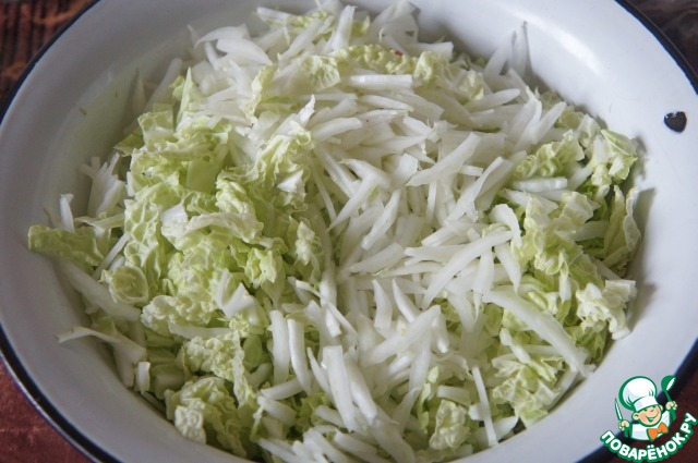 В рецепте используется эндивий, но Джон разрешил заменить его на цикорий или китайскую капусту. Поскольку и эндивий, и цикорий в наших северных краях жуткая экзотика, берем более доступную китайскую капусту. Её надо нарезать лапшой.