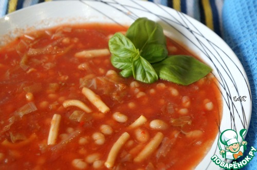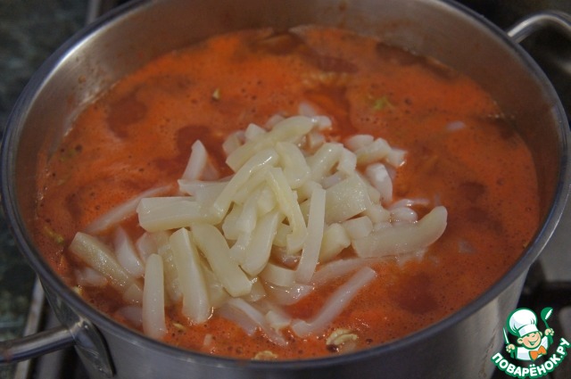 Довести до кипения, добавить, фасоль и капусту, нарезанную лапшой. Посолить и проварить 10 минут.