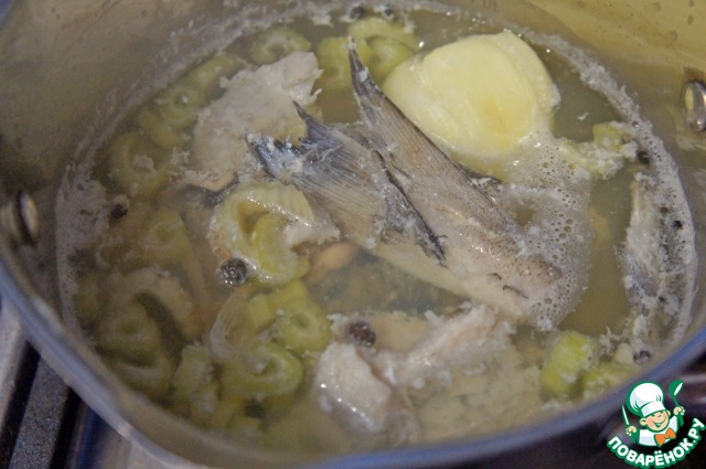 Когда я готовлю рыбу, никогда не выкидываю отходы (хвостик, плавники, кости, даже чешую - все в морозилку, пригодится для бульона). Вот из таких отходов от трески с добавлением луковицы, пары черешков сельдерея, черного и душистого перца горошком и гвоздички я и приготовила бульон для супа. Если же сварить суп на воде, получится постный вариант.