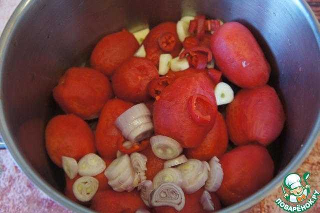 Помидоры очистить от кожицы, лук, чеснок и горький перец нарезать кусочками.