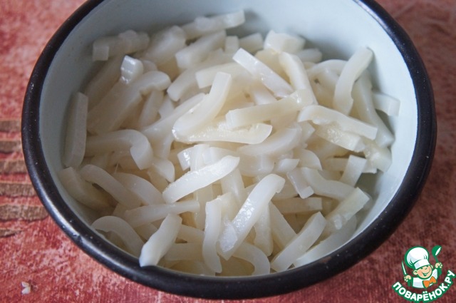 После чего добавить нарезанные лапшой кальмары, 2-3 лавровых листика и проварить 2-3 минуты.