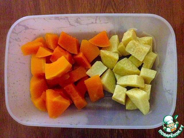 Очистить от кожицы тыкву и корень сельдерея, порезать на небольшие кусочки и отварить до готовности