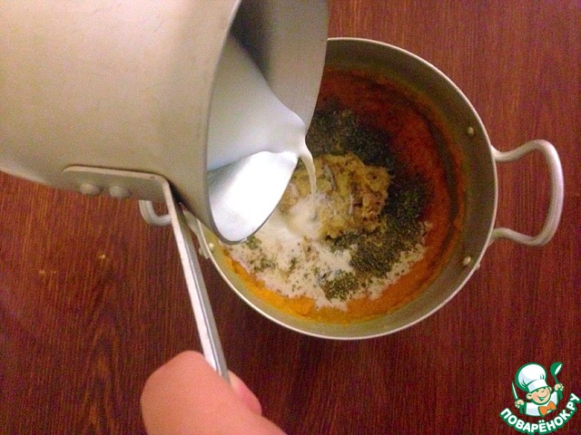 4. Добавляем подогретое молоко (для вегетарианцев или постящихся либо внимательно следящих за фигурой молоко можно заменить водой).