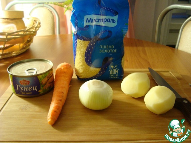 Берём всё, что нам нужно для супа. В кастрюлю наливаем 1,5 л воды и ставим на огон, доводим до кипения и кладём горсть пшена.