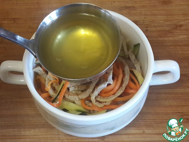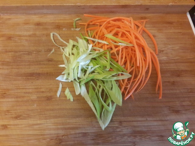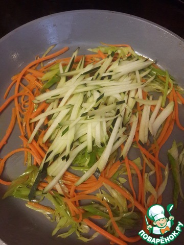 На небольшом количестве масла слегка спассеровать лук-порей с морковью. Затем добавить нарезанные соломкой цуккини и готовить еще 1 минуту. Слегка посолить и приправить перцем