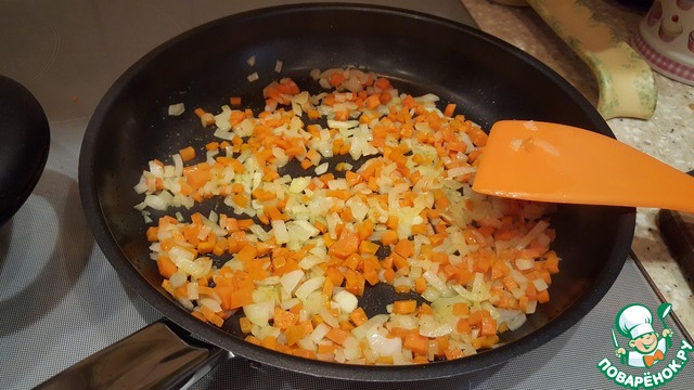 Пока горох варится, чистим и режем лук и морковь. Мне нравится нарезка мелкими кубиками. Обжариваем лук с морковью.