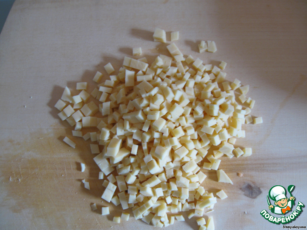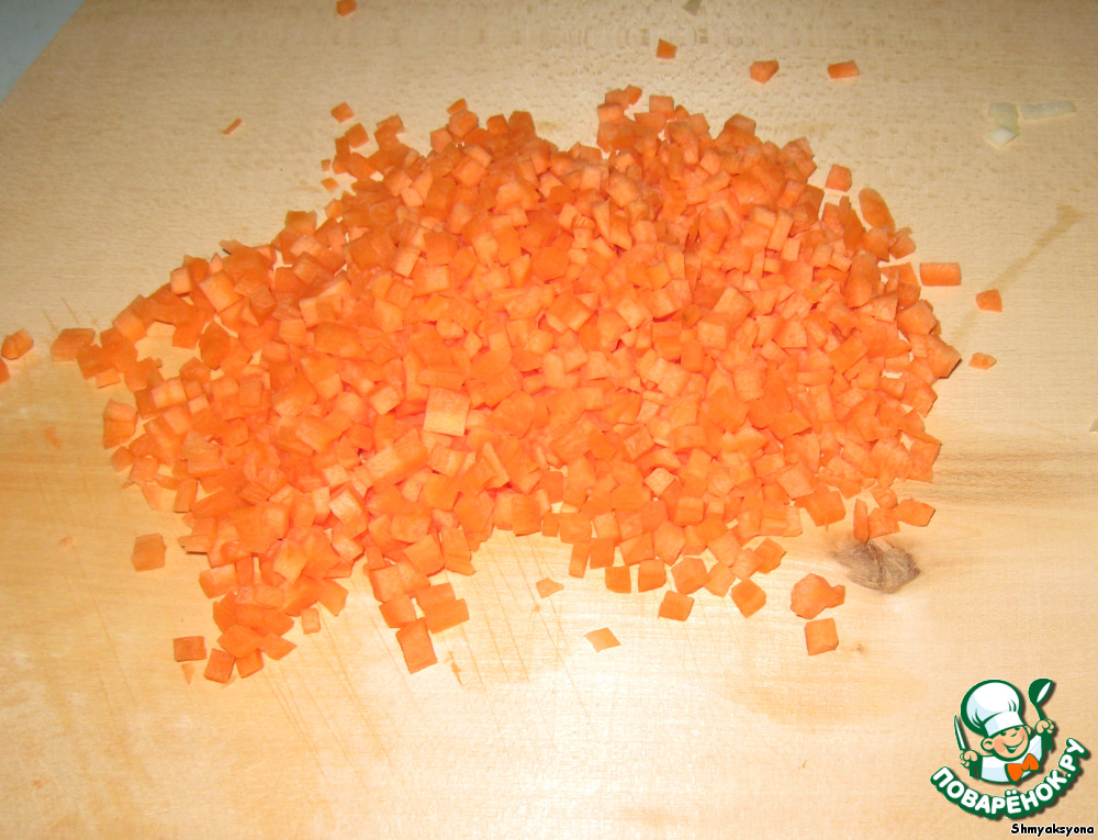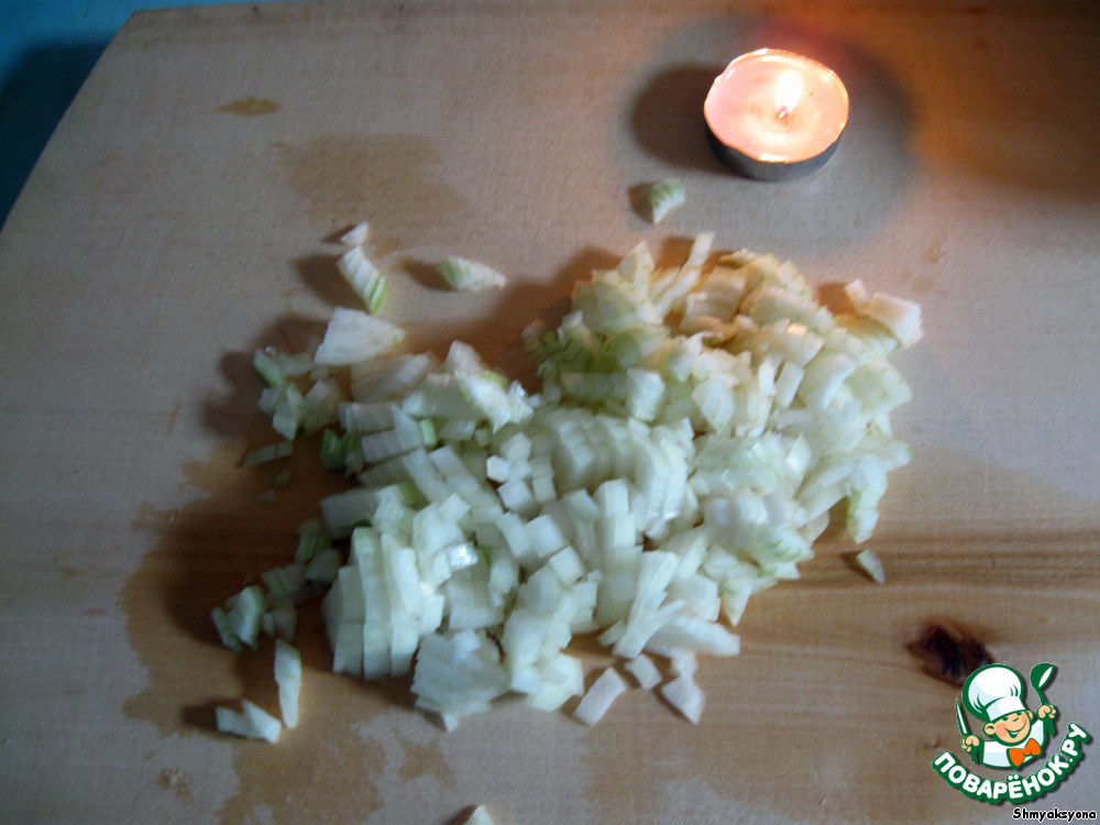 Лук нарезать мелкими кубиками. Маленькая хитрость: если попался очень "злой" лук, можно поставить рядом зажженную свечку, и лук не заставит вас проливать слезы.
