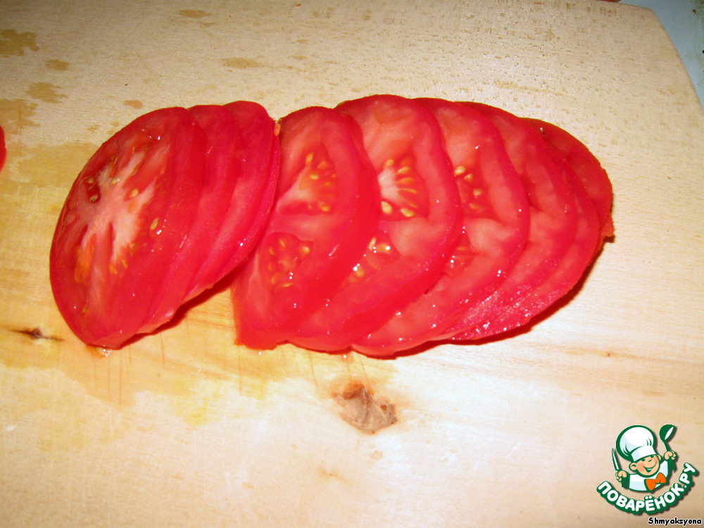 Затем кружочек помидора и зелень. Зелень можно крупно нарезать или просто отщипнуть несколько листиков и положить на бутерброд.