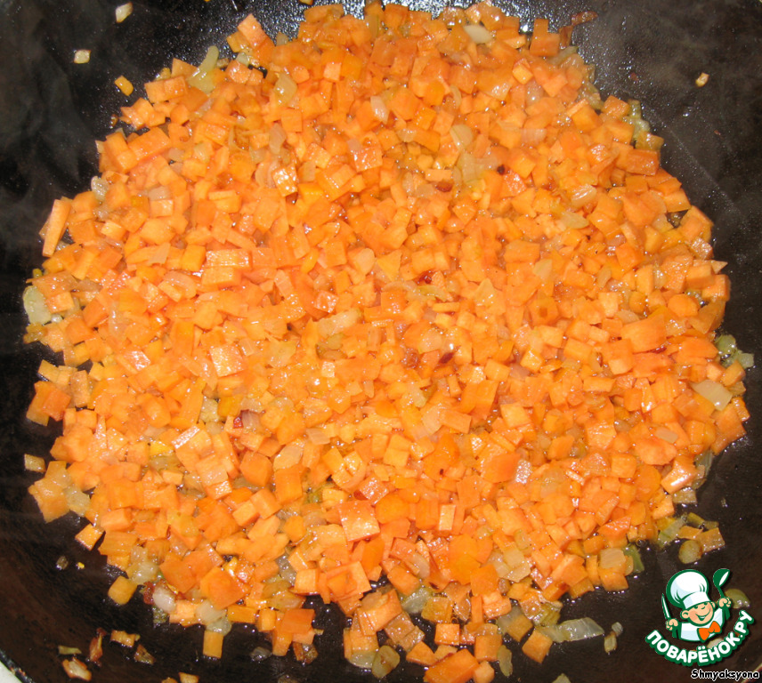 Добавляем морковь, продолжаем обжаривать на среднем огне еще 3-4 минуты.