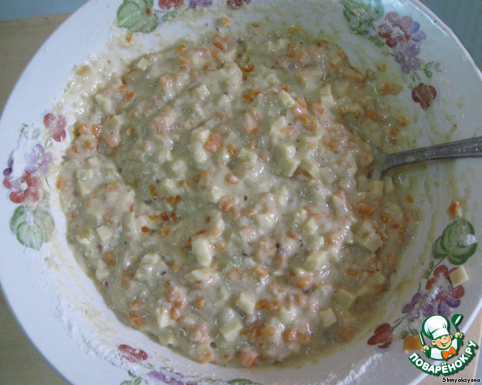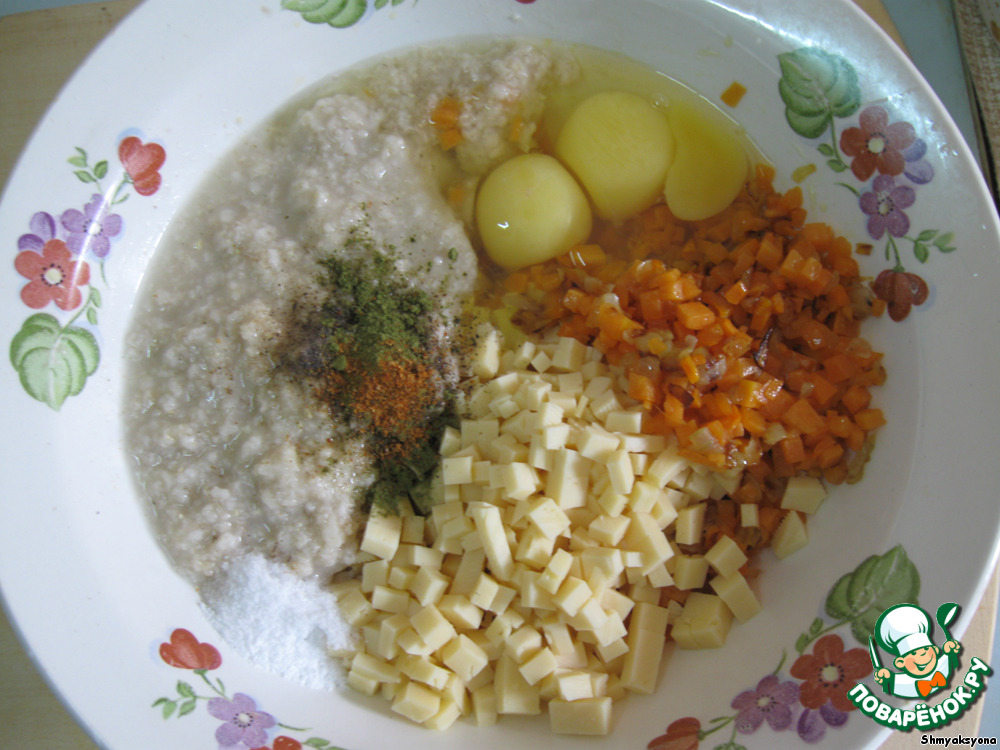 Даем буквально пару минут остыть смеси лука и моркови, выкладываем в глубокую миску, добавляем овсяные хлопья (предварительно слив воду), яйца, сыр, нарезанный кубиками, соль, специи и муки примерно 0,5 стакана. Если немного жидковато, можно добавить еще муки.