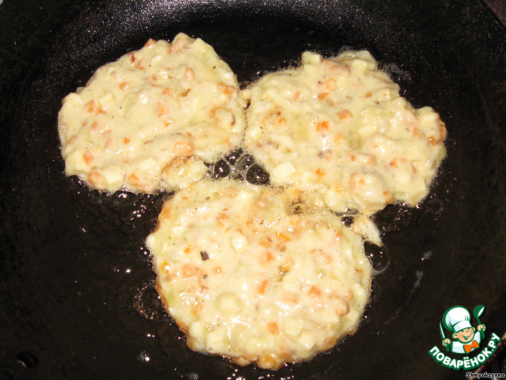 Из получившегося теста формируем ложкой на предварительно нагретой сковороде плоские котлетки, размером с кружочек батона. Обжариваем с двух сторон до золотистого цвета.