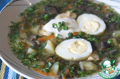 При подаче налить суп в тарелку, добавить вареное яйцо, украсить сметаной и зеленью по вкусу. Приятного аппетита!