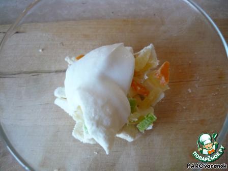 Добавляем мелко порезанный сушеный ананас и сметану. Перемешиваем. Масса должна иметь выраженную кислинку сметаны, но не растекаться (держать форму)