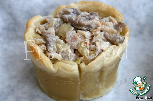 Если нет времени готовить тарталетки самим - их можно заменить французским батоном. Разрезать его на небольшие кружочки, из кружочков вырезать мякиш, оставив донышко. Добавить начинку и поставить на 15 минут в духовку - хлебушек подрумянится и станет хрустящим - это тоже очень вкусно, но моему мужу больше понравилось в слоeном тесте.