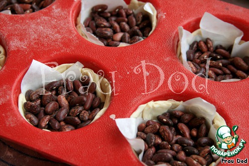 Выложить в формочки, проткнуть вилкой. Сверху положить по кусочку пергамента, на него высыпать фасоль/горох, чтобы тарталетки держали форму. Выпекать в предварительно разогретой до 180 градусов духовке 15 минут. Тесто должно пропечься не до конца.