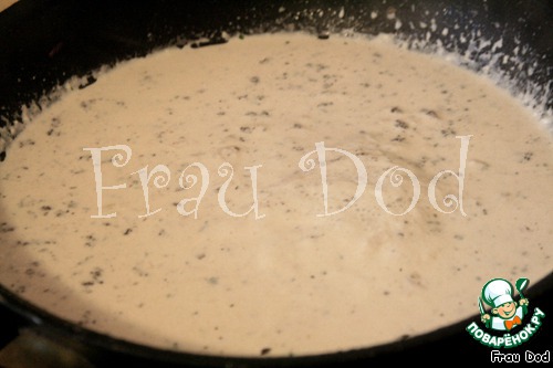Сливки вылить в сковороду, довести до кипения, но не кипятить. Убавить огонь, высыпать приправу для жульена, сушеные грибы, перемешать. 5 минут томить до появления вкусного грибного аромата. Вылить готовый соус в смесь грибов, лука и курочки. Хорошенько перемешать.