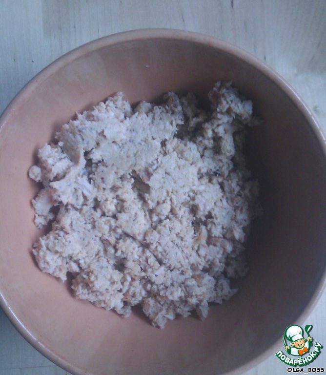 Окорочок готовим по рецепту http://www.povarenok.ru/recipes/show/39441/ Охлаждаем, отделяем мясо от костей, перемалываем в блендере.