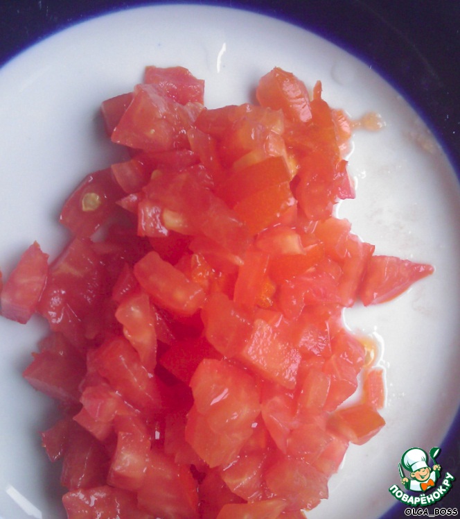Помидоры очищаем от семян (жидкость нам ни к чему), по желанию можно избавиться и от кожицы. Нарезаем мелкими кубиками.