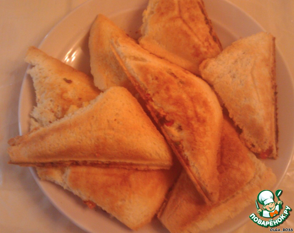 Хлеб нарезаем квадратами, подходящими для бутербродницы. Выкладываем на кусок хлеба начинку, закрываем вторым куском и отправляем в разогретую и смазанную сливочным маслом бутербродницу на пару-тройку минут.