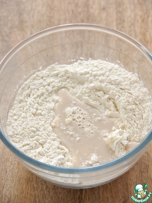 Муку смешать с солью, влить разведенные дрожжи и остальную воду.
