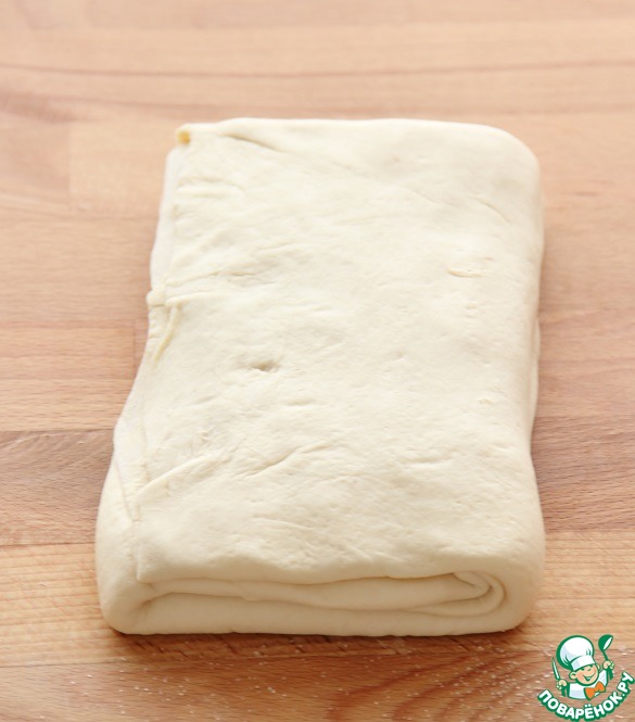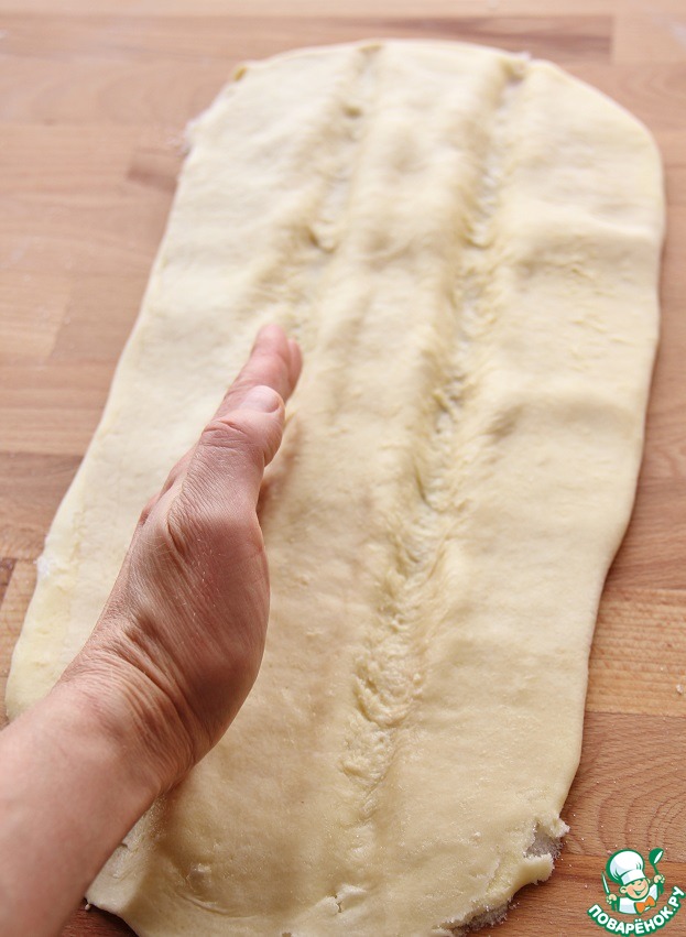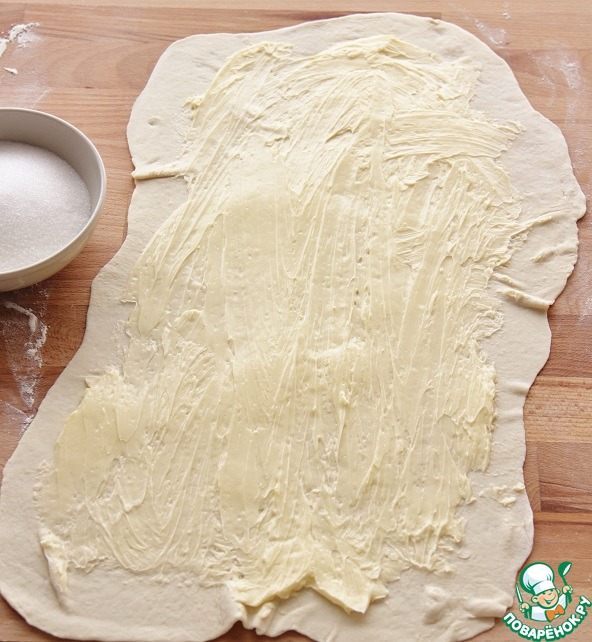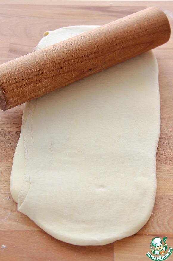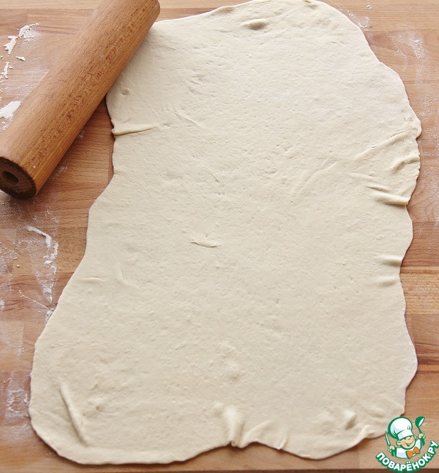 Раскаточную доску присыпать мукой и раскатать тесто в прямоугольник или овал, толщиной где-то 0,5см. Особенной регулярности я не добивалась.