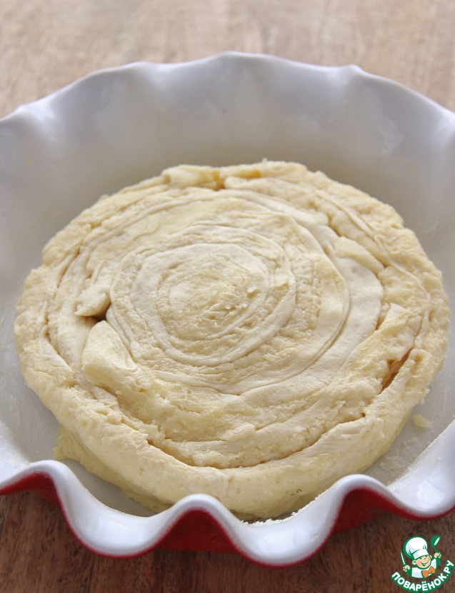 Свернула тесто в улитку прямо в форме. Форму предварительно смазать маслом и покрыть бумагой для выпечки. Раздвижная форма не подойдет.