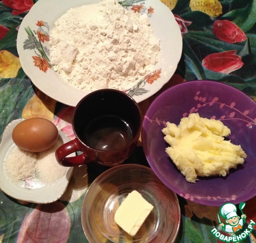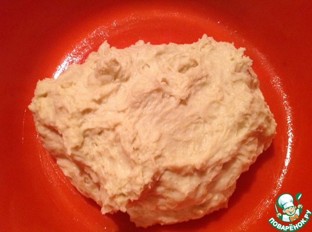 Добавить картофельное пюре и растопленное сливочное масло. Замесить. Получим однородное, чуть липкое тесто. Смазать миску растительным маслом, выложить туда тесто. Накрыть пленкой и дать постоять минут 30 в теплом месте.