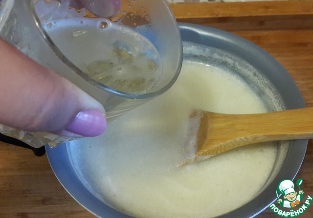 Разбухший желатин нагреть до полного растворения и ввести в горячую манную смесь, постоянно помешивая
