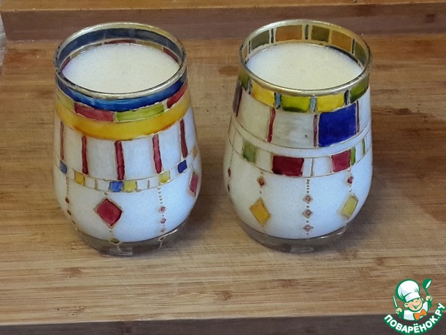 Стаканчики, в которых подано желе, расписаны вручную моей подругой. Она большая мастерица росписи по стеклу. А вообще, этому промыслу уже много-много столетий. Он возник в средние века, когда, собственно, и было придумано само стекло. Изначально, конечно же, тогдашние мастера расписывали стекла в храмах - оттуда, собственно, и пошла роспись по стеклу, но с течением времени этот промысел распространился и на быт. Самым популярным изделием из стекла, которое расписывали красками, была, конечно же, бутылка или кубок. Мотивы изначально были религиозными, позже на кубках появилась роспись в виде гербов того или иного рода. И уже ближе к современности роспись по стеклу обрела чисто декоративный, бытовой характер. Сегодня не существует ограничений в выборе основы под роспись. Если имеется стеклянная поверхность, значит, она может быть расписана. Окна, двери, потолки, межкомнатные перегородки, фасады, витрины, лестницы, настенные панно, лампы, светильники, плафоны люстр, мебель, зеркала, шкафы-купе, зимние сады, декоративные ширмы – все это может быть украшено витражной росписью. Большой популярностью пользуется роспись предметов декора: ваз, бутылок, подсвечников, стаканов, тарелок и т. п. Вообще расписное стекло в интерьере разнообразит его и делает воистину уникальным. Интерьерная роспись по стеклу создаст в вашем доме особенное настроение, неповторимую атмосферу, сотканную переливов из цвета и света.
