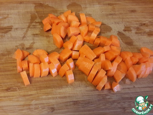 Морковь (сырую) нарезать кубиками и отправить вариться в пряный сироп. Варить около 10-15 минут, пока сироп не закарамелизуется.