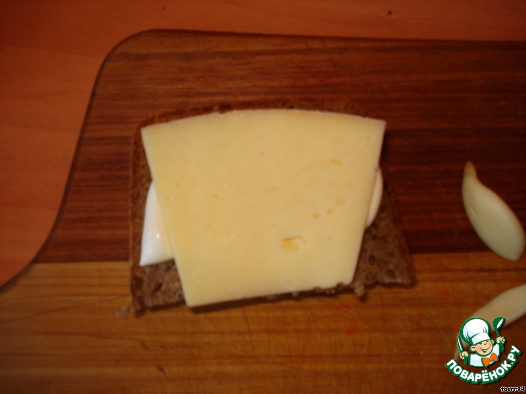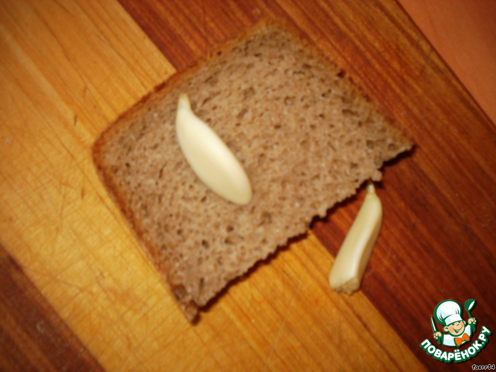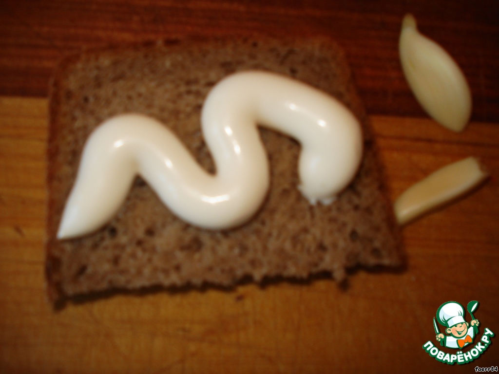 Кружочки черного хлеба слегка обжарить, натереть чесночком (можно не обжаривать, просто свежий хлебушек натереть чесночком).