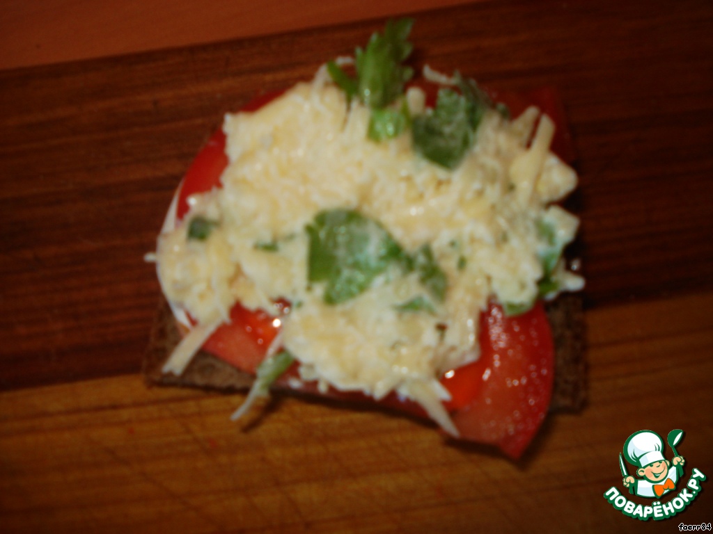 Натираем на мелкой терке сыр, добавляем чесночок, зелень, заправляем все майонезом и выкладываем на помидор.