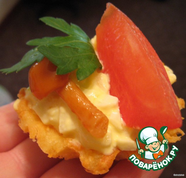 Корзиночки наполняем начинкой, оформляем зеленью, грибами и помидорами. Я сделала маленькие корзиночки, поэтому грибочек только один поместился. В идеале их должно быть штук 5-6 сверху.