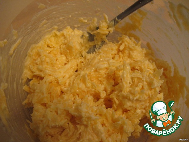 Сыр натираем на крупной терке, маргарин разминаем с яйцом, солим.