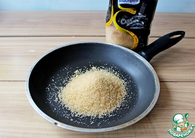 Пока готовится тарт, займемся грушами в карамели Для этого в сухую сковороду выложить сахар Демерара Мистраль и оставить на небольшой огонь, не помешивая!!! готовить пока сахар полностью не растворится.