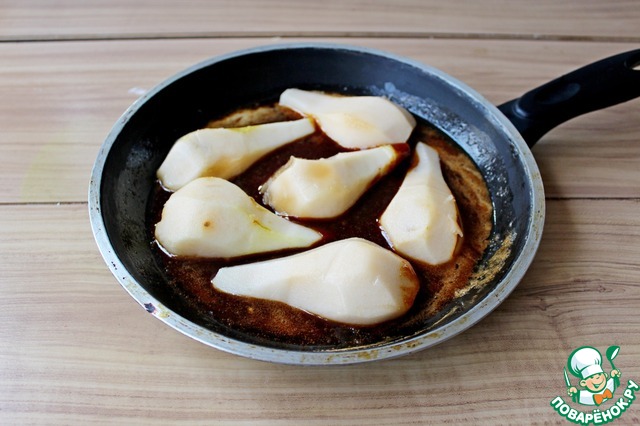 Готовим груши 5 мин на медленном огне переодически их переворачивая!