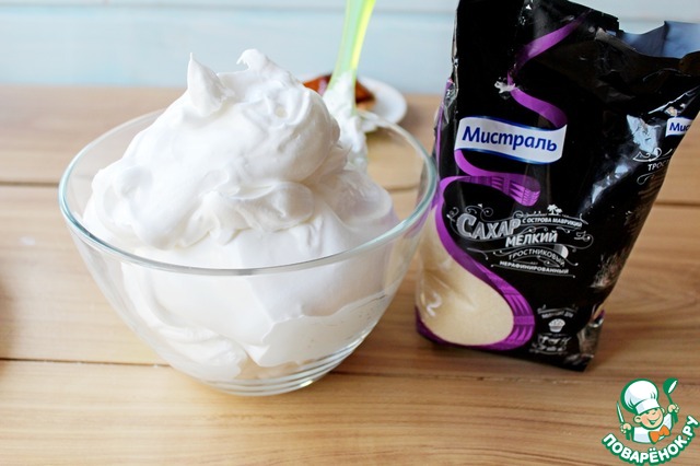 Для приготовления итальянской меренги, в чашу блендера (абсолютно сухую и чистую!) выложить яичные охлажденные белки и начать их взбивать, взбивать до мягких пиков, тем же временем одновременно, ставим кастрюльку со 100 мл воды на маленький огонь, добавить мелкий сахар Мистраль и варить с момента закипания 5 мин или если есть термометр до 120 гр, постоянно помешивая.
