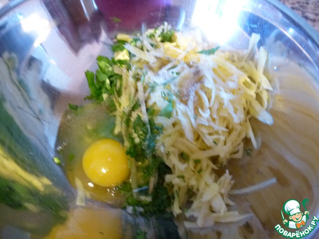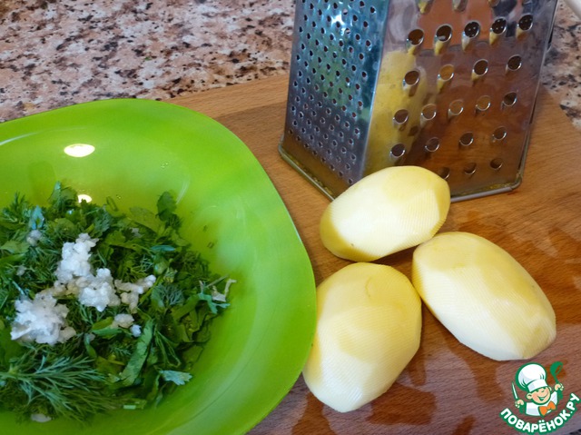 В миску нашинковать зелень, выдавить два зубчика чеснока.