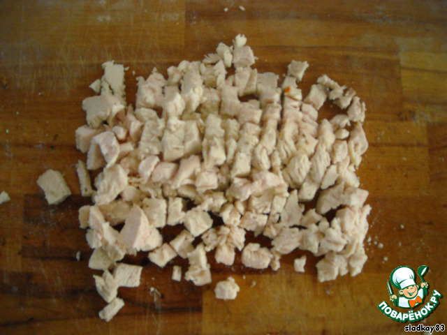 Спассеровать лук на растительном масле, добавить грибы и немножко воды. Тушить, пока вода не выпарится. Добавить куриное филе и перемешать.