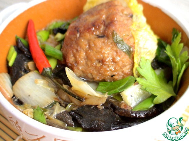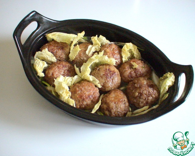 Выложить в сотейник мясные шарики, перекладывая их зелёными частями пекинской капусты.